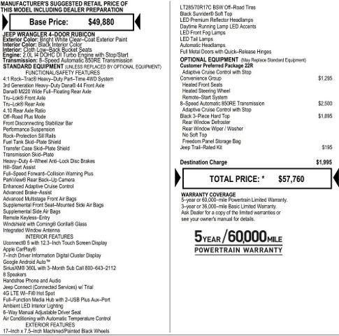 NO HOOKS, NO GIMMICKS, DO NOT LET OTHER DEALERS TELL YOU OTHERWISE! You could qualify for even more incentives, please call dealer for details. Black 3-Piece Hard Top, Convenience Group, Freedom Panel Storage Bag, Heated Front Seats, Heated Steering Wheel, Jeep Trail Rated Kit, Quick Order Package 22R Rubicon, Rear Window Defroster, Rear Window Wiper/Washer, Remote Start System, Universal Garage Door Opener. You pay the price listed plus a $604 admin fee, applicable tax, title and license less any extra incentives if available and/or applicable. Please call 573-677-1300 for more details! Laura Auto Group, serving our communities for over 44 years. Please call dealer to verify vehicle availability. Price good through 1/5/26. CDJR Loyalty Bonus Cash $1,500 - Exp. 02/02/2026 National Select Inventory Bonus Cash $2,000 - Exp. 02/02/2026 National Select Inventory Bonus Cash $1,500 - Exp. 01/04/2027