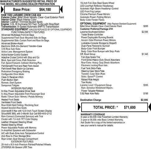 Laura Chrysler Dodge Jeep RamDisclaimersYou pay the price listed plus a $604 admin fee, applicable tax, title and license less any extra incentives if available and/or applicable. Please see dealer for additional details.