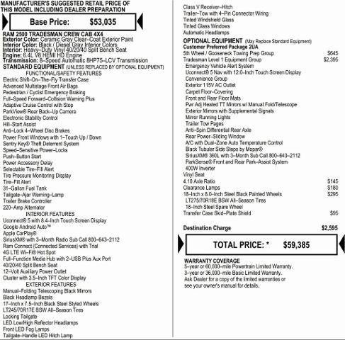 NO HOOKS, NO GIMMICKS, DO NOT LET OTHER DEALERS TELL YOU OTHERWISE! You could qualify for even more incentives, please call dealer for details. 115-Volt Auxiliary Front Power Outlet, 12" Touchscreen Display, 4.10 Axle Ratio, 400W Inverter, 4G LTE Wi-Fi Hot Spot, 5th Wheel/Gooseneck Towing Prep Group, Air Conditioning ATC with Dual Zone Control, Alexa Built-in, Apple CarPlay, Auto-Dimming Rear-View Mirror, Black Wheel Center Hub, Clearance Lamps, Connected Travel and Traffic Services, Connectivity - US/Canada, Disassociated Touchscreen Display, Emergency Vehicle Alert System (EVAS), Exterior 115V AC Outlet, For Details, Visit DriveUconnect.com, For More Info, Call 800-643-2112, Global Telematics Box Module, Google Android Auto, GPS Antenna Input, GPS Navigation, HD Radio, Integrated Voice Command with Bluetooth®, Off-Road Info Pages, Quick Order Package 2UA Tradesman, Radio: Uconnect 5 Navigation with 12.0" Display, Rear Power Sliding Window, Selectable Tire Fill Alert, SiriusXM Radio Service, SiriusXM with 360L, Tinted Acoustic Windshield Glass, Tradesman Level 1 Equipment Group, Trailer Tow Pages, Wheels: 18" x 8.0" Black Painted Steel. You pay the price listed plus a $620 admin fee, applicable tax, title and license less any extra incentives if available and/or applicable. Please call 573-677-1300 for more details! Laura Auto Group, serving our communities for over 44 years. Please call dealer to verify vehicle availability. Price good through 3/31/26. Price includes: $1000 - 2026 National Bonus Cash . Exp. 03/31/2026 Laura Bonus Savings $1,000 - Exp. 03/09/2026 Laura Trade Assist $1,500 - Exp. 03/09/2026 Commercial Bonus Cash $500 - Exp. 03/31/2026