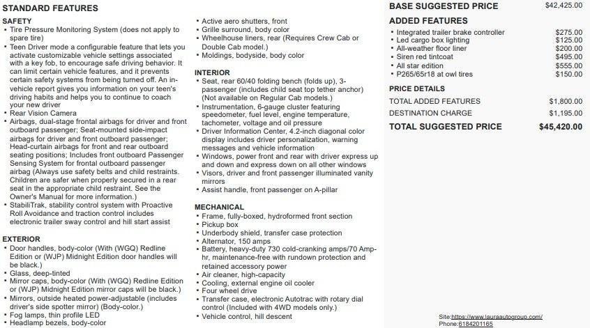 Laura Chrysler Dodge Jeep RamDisclaimersYou pay the price listed plus a $620 admin fee, applicable tax, title and license less any extra incentives if available and/or applicable. Please see dealer for additional details.
