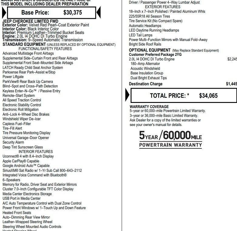 Carfax 1 Owner New Vehicle Trade! Cherokee Limited, SUV, 2.0 I4, FWD, 9 Speed Automatic, Heated Front Seats, Heated Steering Wheel, Power Liftgate, Blind Spot Monitoring, Rear View Camera, Dual Zone Automatic Climate Control, Remote Start, Keyless Entry, Power Windows, Power Locks, Power Mirrors. This Vehicle has good tires, is in good condition and is ready for many more miles! This Cherokee has a clean vehicle history report and does not have any accidents. Call us today, this vehicle won't last long at this price 573-677-1305! Laura Automotive Group, serving our communities for over 43 years!! We are a family owned dealership committed to providing our customers the best deals backed by outstanding service!