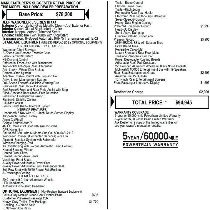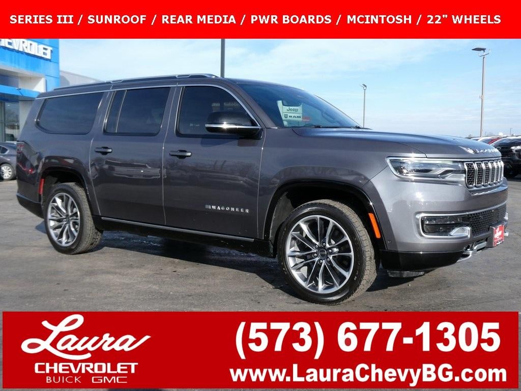 Carfax 1 Owner New Vehicle Trade! Wagoneer L Series III, 3.0 I6, 4WD, 8 Speed Automatic, HD TRAILER TOW PACKAGE, TRI PANEL MOONROOF, Heated And Cooled Leather, MCINTOSH Premium Audio, Quadra Lift Air Suspension, Uconnect 5 NAV, Adaptive Cruise Control, Power Liftgate, Power Running Boards, Trailer Brake Controller, Remote Keyless Entry, Power Windows, Power Locks, Power Mirrors. This vehicle has good tires, is in good condition and is ready for many more miles! This Wagoneer has a clean vehicle history report and does not have any accidents. Call us today, this vehicle won't last long at this price 573-677-1310! Laura Automotive Group, serving our communities for over 43 years!! We are a family owned dealership committed to providing our customers the best deals backed by outstanding service!